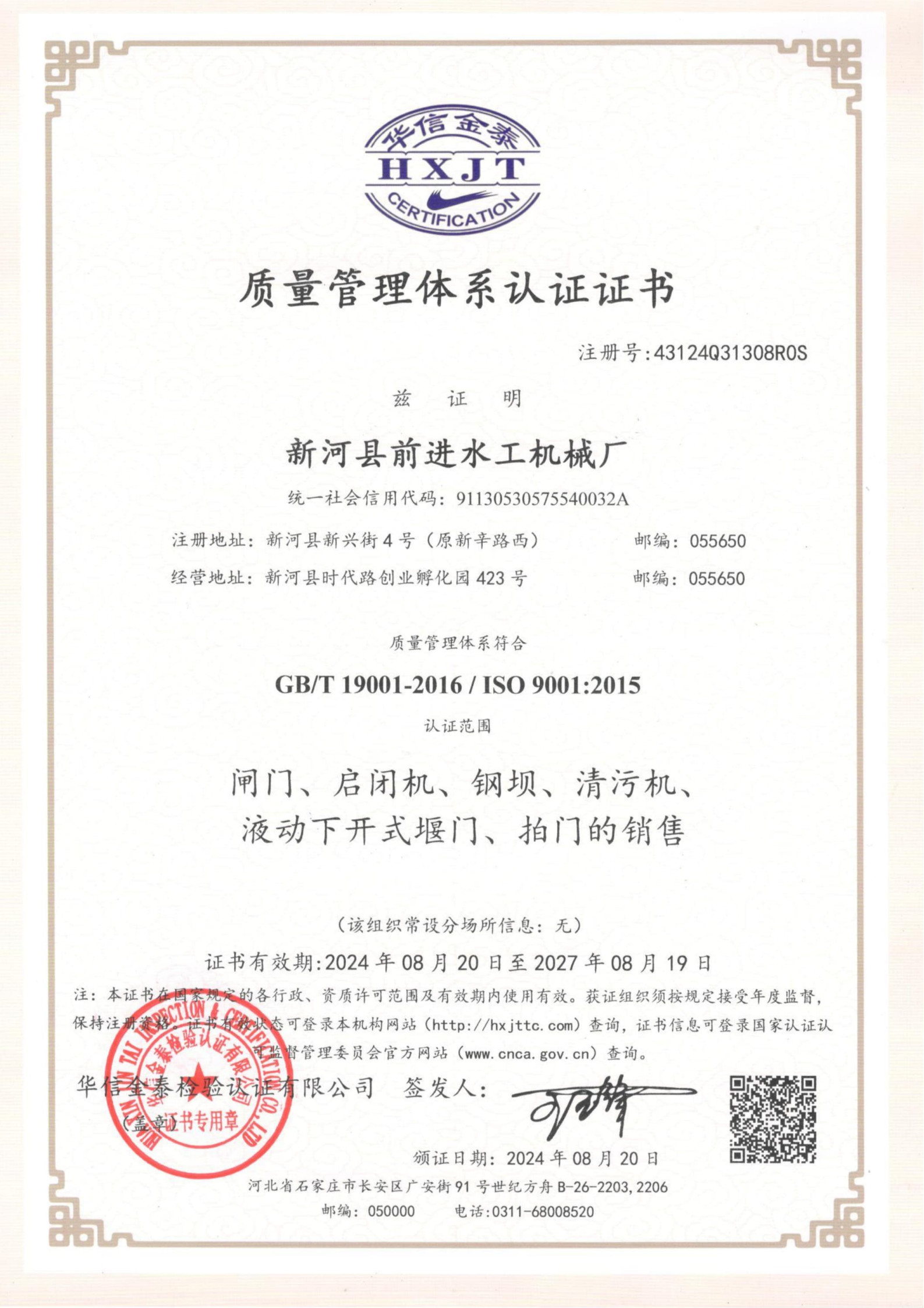 新河縣前進水工機械廠是一家專門從事水利工程設備研發生產的廠家,現有員工228人,各類高、中級專業工程技術人員近30人,技術生產工人180多人。公司占地面積14674平方米。公司擁有車、鉗、刨、銑、冷作、鈑金、鑄造等,工種齊全,加工能力和技術力量雄厚,并具備理化測試手段與儀器設備。前進水工專注景觀閘門,鋼壩,合頁壩,液壓升降壩,液壓閘門,臥倒門,一字門,人字門,液壓啟閉機,卷揚啟閉機,螺桿啟閉機,清污機,除污機,閘門,拍門等設備的研發與生產,是新河水利工程產品行業的領跑者,不僅在同行業群中揭起了一次又一次的技術革新,更為水利工程企業提供了更高更大的選擇平臺。